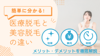 この記事では医療脱毛と美容脱毛の効果・費用・期間・痛み・施術方法・施術者・メリット・デメリットの違いについて詳しく解説しています。医療脱毛と美容脱毛のどちらを選べばいいのか悩んでいる方におすすめの記事です。この記事を読むことで医療脱毛と美容脱毛について深く理解することができます。